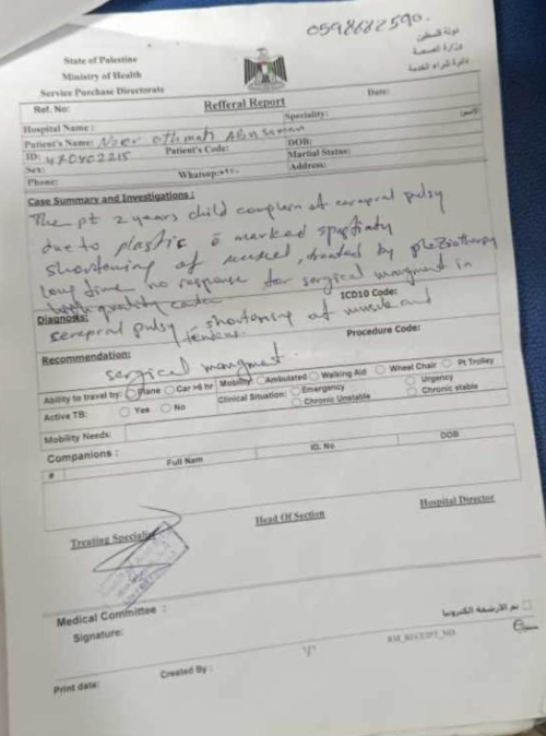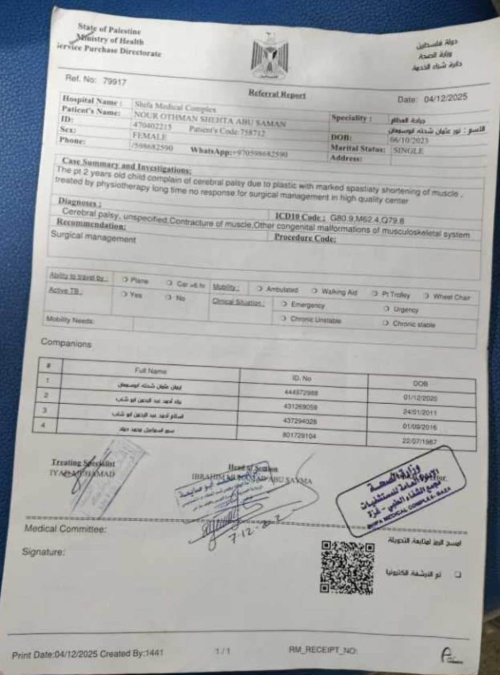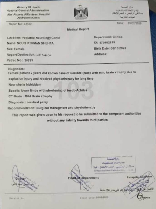 نور بحاجةٍ ماسّة إلى العلاج في مستشفى تخصصي لأمراض الدماغ والأعصاب، حيث يمكن أن تتلقى الرعاية التي قد تمنحها فرصة لتحسين حالتها. لكن في غزة، لم يعد المرض أزمةً صحية فحسب، بل مأساةً مركّبة. مستشفيات تفتقر إلى الأدوية، أجهزة تعمل بالكاد، وانقطاعٌ متكرر للكهرباء يهدّد حياة المرضى. العلاج رحلة شاقة، تبدأ بالأمل وتنتهي غالباً بالانتظار.