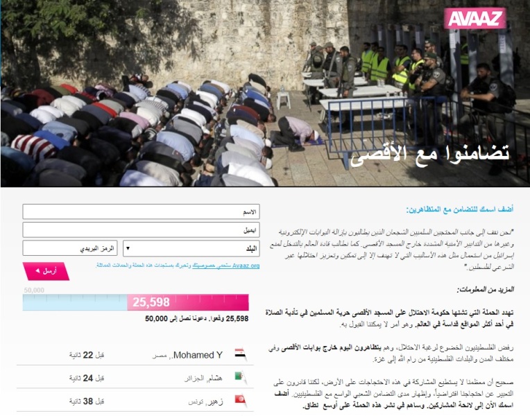 عريضة إلكترونية للتضامن مع الأقصى عبر موقع "أفاز" العالمي