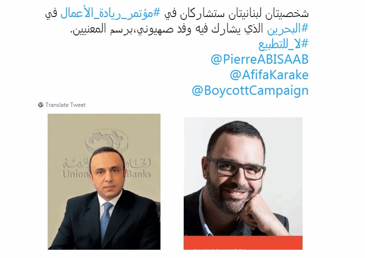 يشارك رجليّ أعمال لبنانيين في مؤتمر ريادة الأعمال في البحرين الذي يشارك فيه وفدٌ إسرائيلي، الأمر الذي دفع نشطاءٌ على مواقع التواصل الاجتماعي للضغط على المشاركان لإلغاء مشاركتهما في المؤتمر.