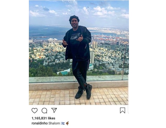 ويظهر في الصورة رونالدينيو في أحد الأماكن المرتفعة وخلفه جزء كبير من الأراضي المحتلة، وأرفقها بكلمة «شالوم» وعلم إسرائيل.