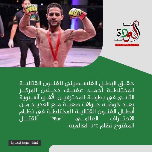 حقق البطل الفلسطيني للفنون القتالية المختلطة أحمد عفيف دحلان المركز الثاني في بطولة المحترفين الأفرو آسيوية بعد خوضه جولات صعبة مع العديد من أبطال الفنون القتالية المختلطة في نظام الاحتراف العالمي "PRuo" القتال المفتوح نظام UFC العالمية.