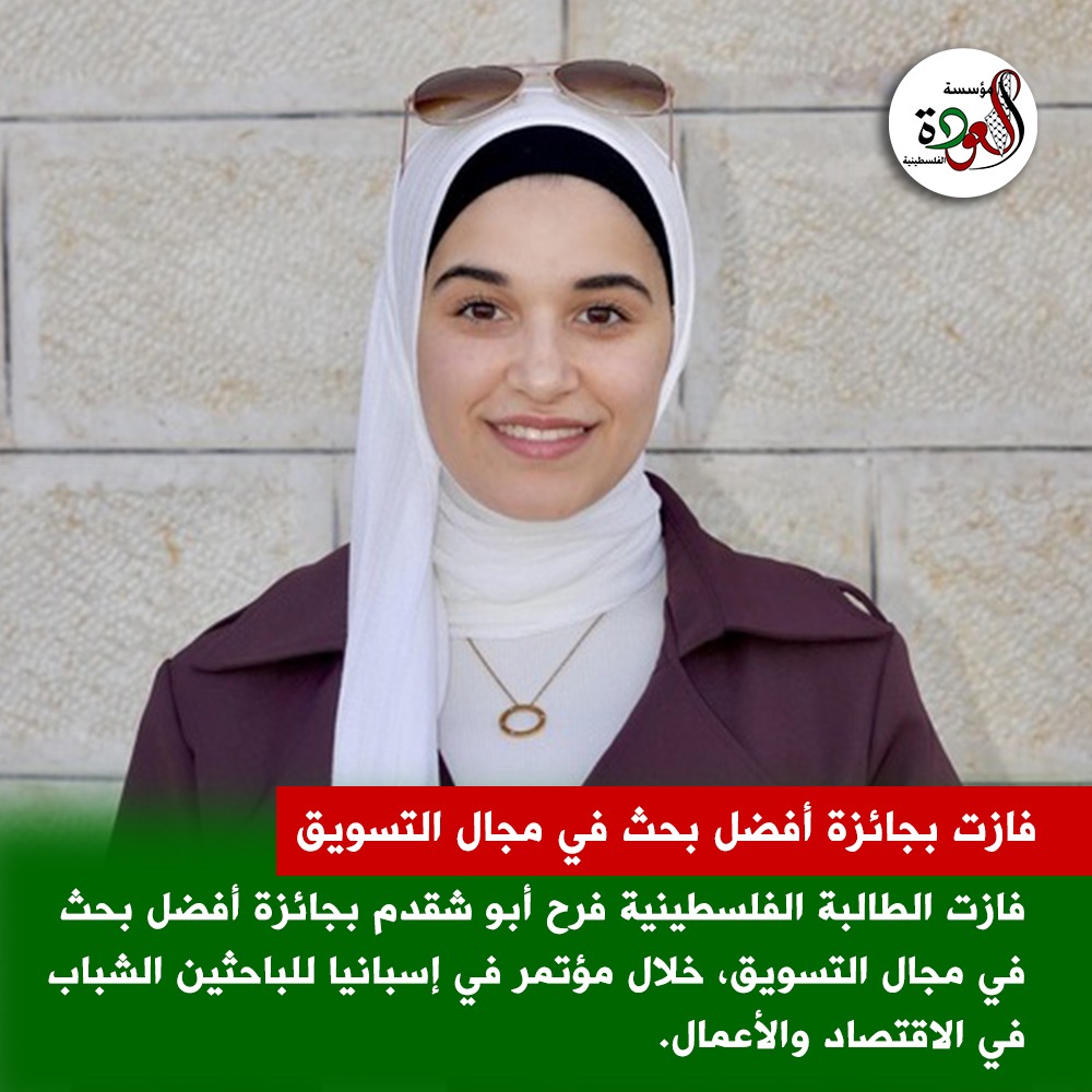 في العاصمة الإسبانية مدريد، فازت الطالبة الفلسطينية فرح محمد أنور أبو شقدم بجائزة أفضل بحث في مجال التسويق خلال أعمال المؤتمر الإيبيرو– الأميركي الثامن للباحثين الشباب في الاقتصاد والأعمال.