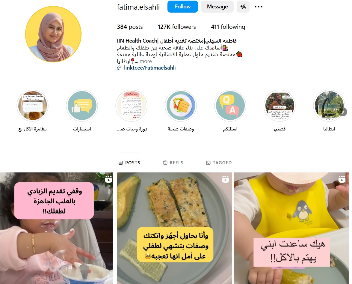 وخلال مشاركتها وجبات طعام ابنتها على تطبيق انستغرام، لاقت "فاطمة" اهتمام آلاف الأمهات التي عانت بعضهنّ من سكر الحمل وأخريات يرغبن باتباع نظامٍ غذائي جيّد لأطفالهنّ، فنجحت في أن تُحوّل وجبة الطعام الى فرصة لبناء علاقة جيدة بين الأطفال وأمهاتهم من خلال دوراتٍ وورش عمل أونلاين، ليتجاوز عدد متابعي صفحتها على اسنتغرام الـ127 ألف متابع.