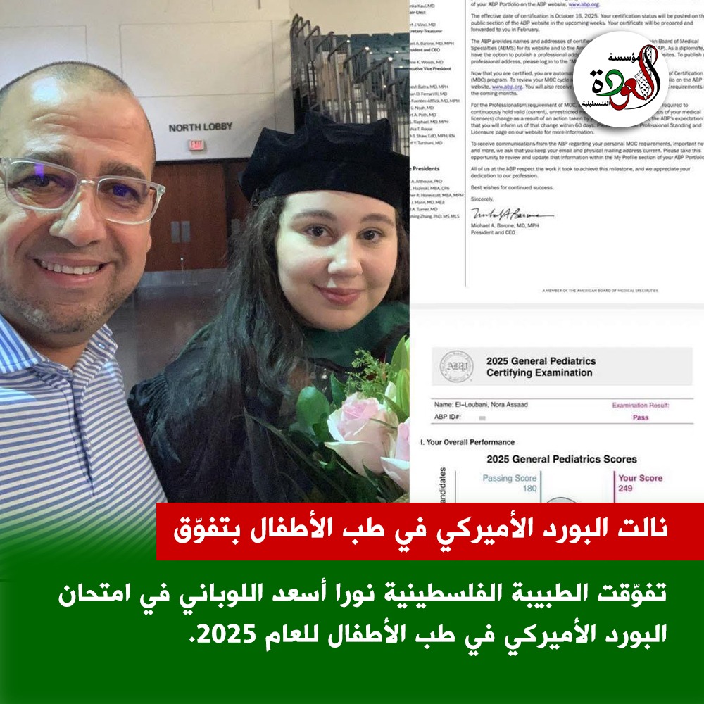 في إنجازٍ يندرج ضمن سلسلة من إنجازات الأطباء الفلسطينيين في دول الاغتراب، تفوّقت الطبيبة الفلسطينية نورا أسعد اللوباني في امتحان البورد الأميركي في طب الأطفال للعام 2025.