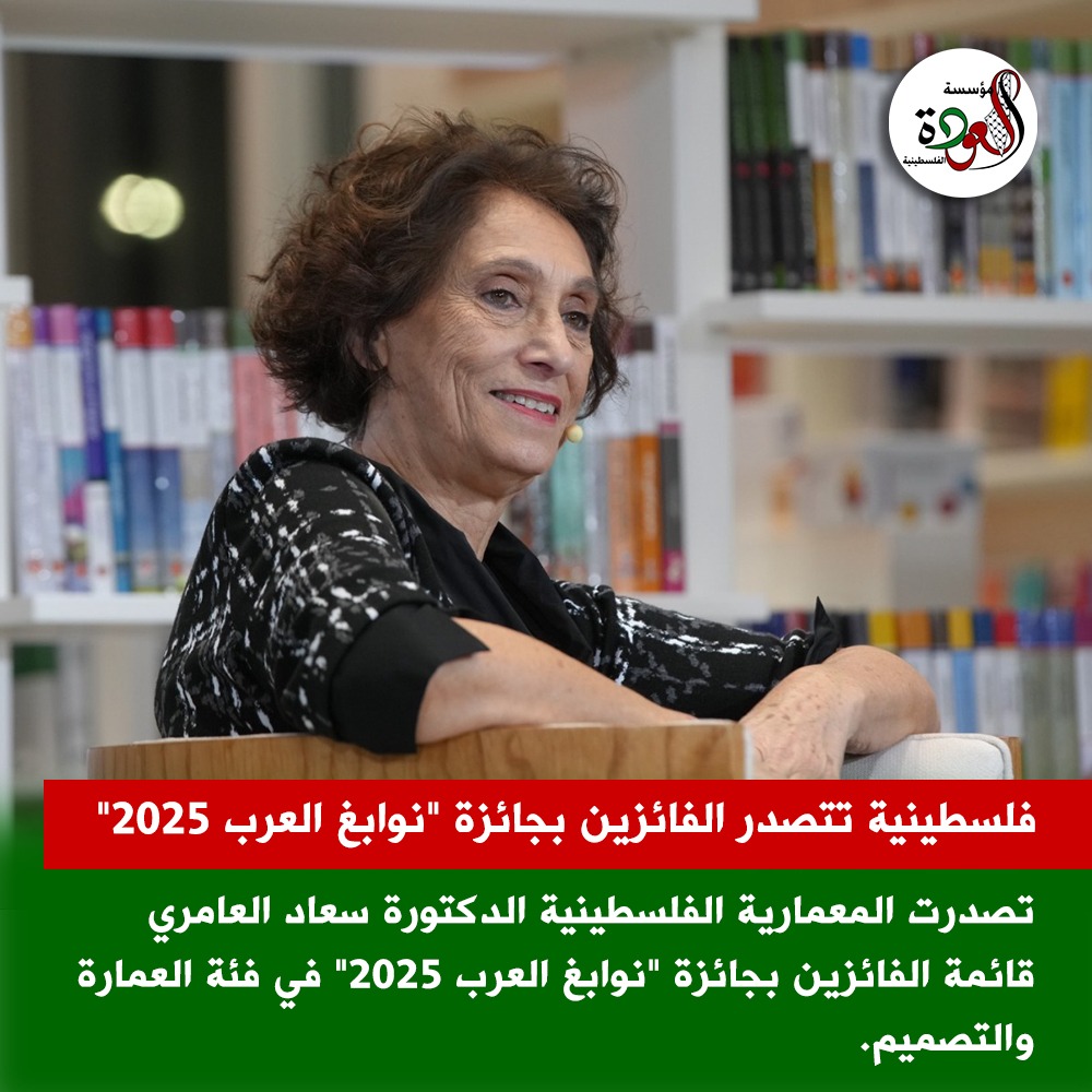 تصدرت المعمارية الفلسطينية الدكتورة سعاد العامري قائمة الفائزين بجائزة "نوابغ العرب 2025" في فئة العمارة والتصميم، تقديراً لمسيرتها المتميزة في حفظ التراث المعماري الفلسطيني وترميم المباني التاريخية وإعادة توظيفها لتعزيز الهوية العمرانية.