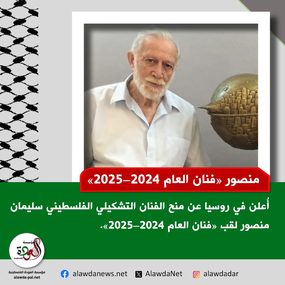 أُعلن في العاصمة الروسية موسكو عن منح الفنان التشكيلي الفلسطيني سليمان منصور لقب «فنان العام 2024–2025»، في حدث ثقافي دولي عكس حضور الفن الفلسطيني في المشهد الفني العالمي، وأبرز مكانته المتقدمة في الأوساط الثقافية الروسية والدولية.