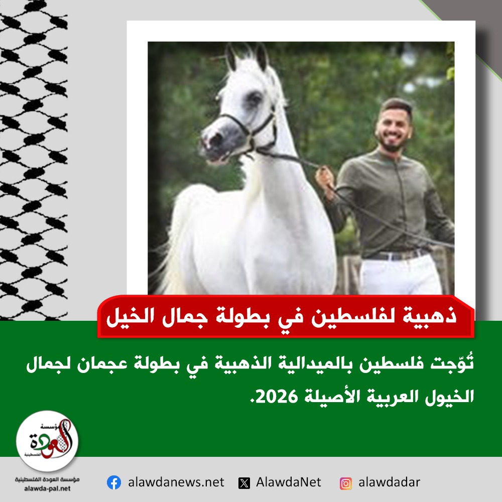 تُوّجت فلسطين بالميدالية الذهبية في بطولة عجمان لجمال الخيول العربية الأصيلة 2026 في دولة الإمارات وذلك بعد فوز الفرس "أ ج أساي" بلقب فئة الأفراس (4 سنوات فما فوق).