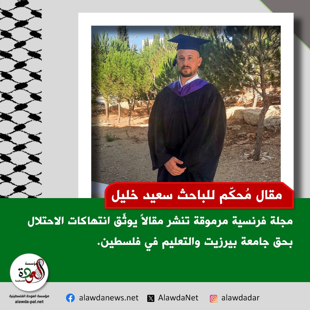 حصل الأكاديمي الفلسطيني أ. سعيد خليل على موافقة لنشر مقاله العلمي الذي يوثّق الانتهاكات والهجمات الإسرائيلية المتكررة بحق جامعة بيرزيت، في مجلة SNESUP الفرنسية، الصادرة عن اتحاد نقابات التعليم العالي الوطنية في فرنسا.