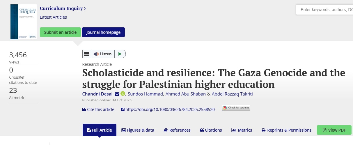 بعد أن رفضت مجلة هارفارد نشره في عددها، نُشرت مؤخرًا دراسة أكاديمية بعنوان "الإبادة المعرفية والصمود: إبادة غزة والنضال من أجل التعليم العالي الفلسطيني" في مجلة Curriculum Inquiry الدولية المحكمة.