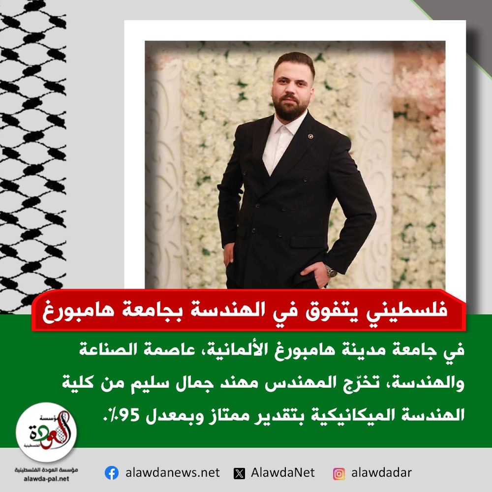 في جامعة هامبورغ بمدينة هامبورغ الألمانية، عاصمة الصناعة والهندسة، حقق المهندس الفلسطيني مهند جمال سليم، إنجازاً أكاديمياً بتخرجه من كلية الهندسة الميكانيكية بتقدير ممتاز وبمعدل 95%.