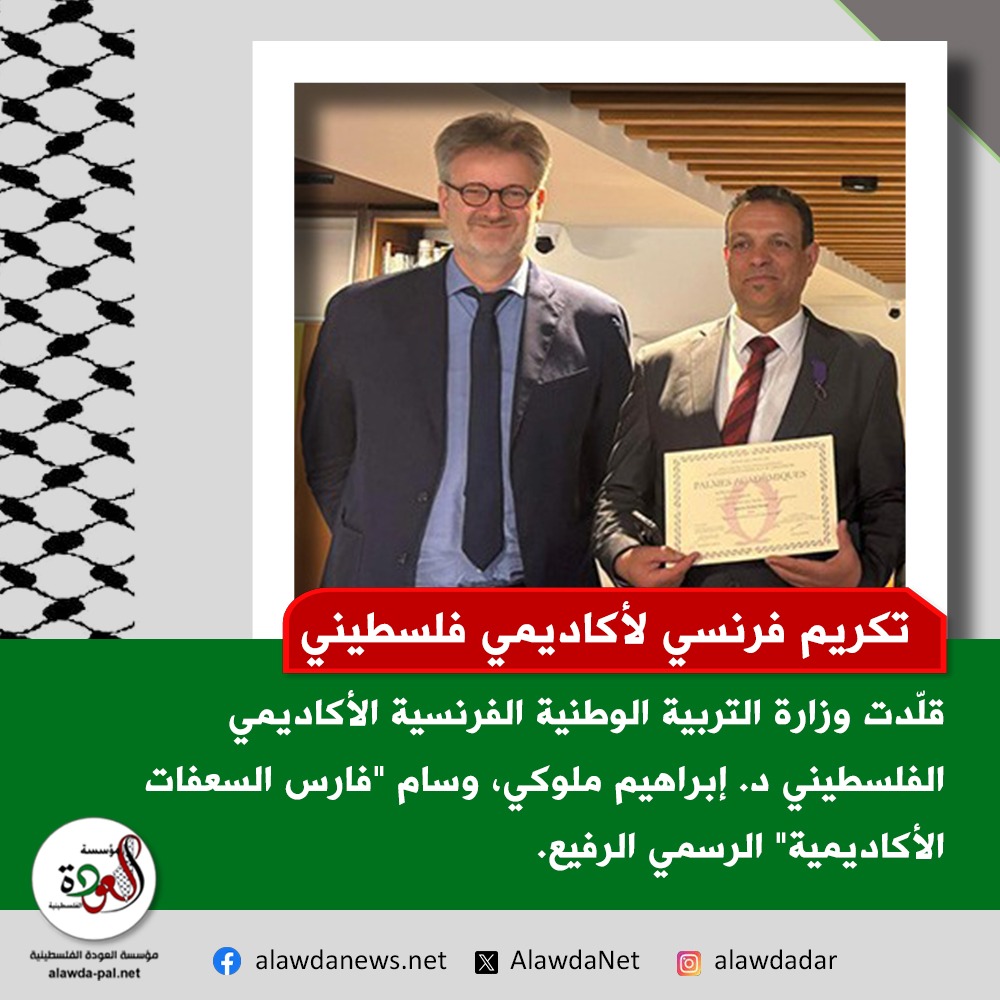 في لفتةٍ تجسّد عبور الإبداع الفلسطيني للحدود، قلّدت وزارة التربية الوطنية الفرنسية الأكاديمي الفلسطيني د. إبراهيم ملوكي، وسام "فارس السعفات الأكاديمية" الرفيع، ليكون هذا التكريم الفرنسي بمثابة وسام فخرٍ على صدر التعليم العالي في فلسطين.