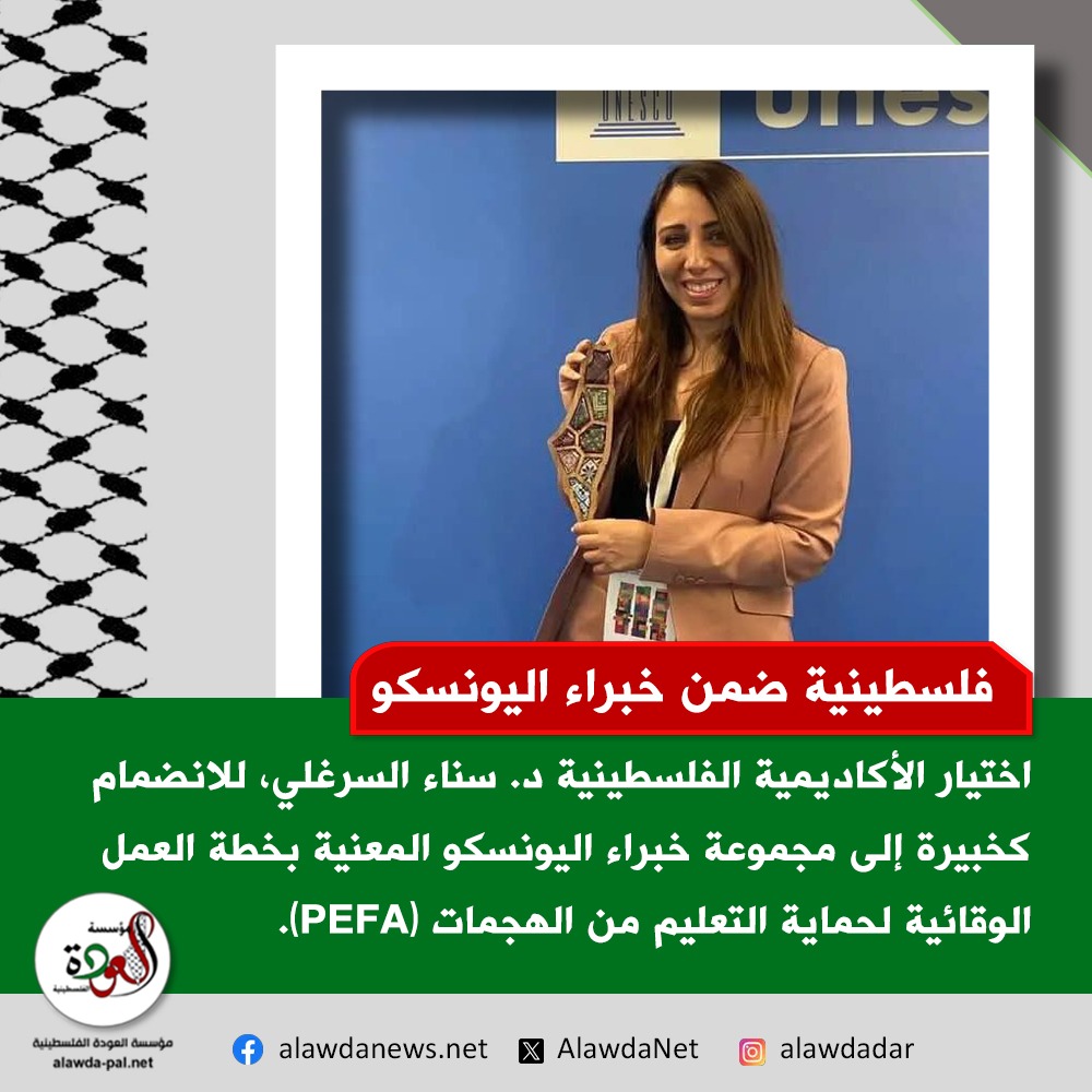 أقرّ المدير العام لمنظمة اليونسكو اختيار الأكاديمية الفلسطينية د. سناء السرغلي، للانضمام كخبيرة إلى مجموعة خبراء اليونسكو المعنية بخطة العمل الوقائية لحماية التعليم من الهجمات (PEFA)، ممثّلةً للمجموعة العربية.