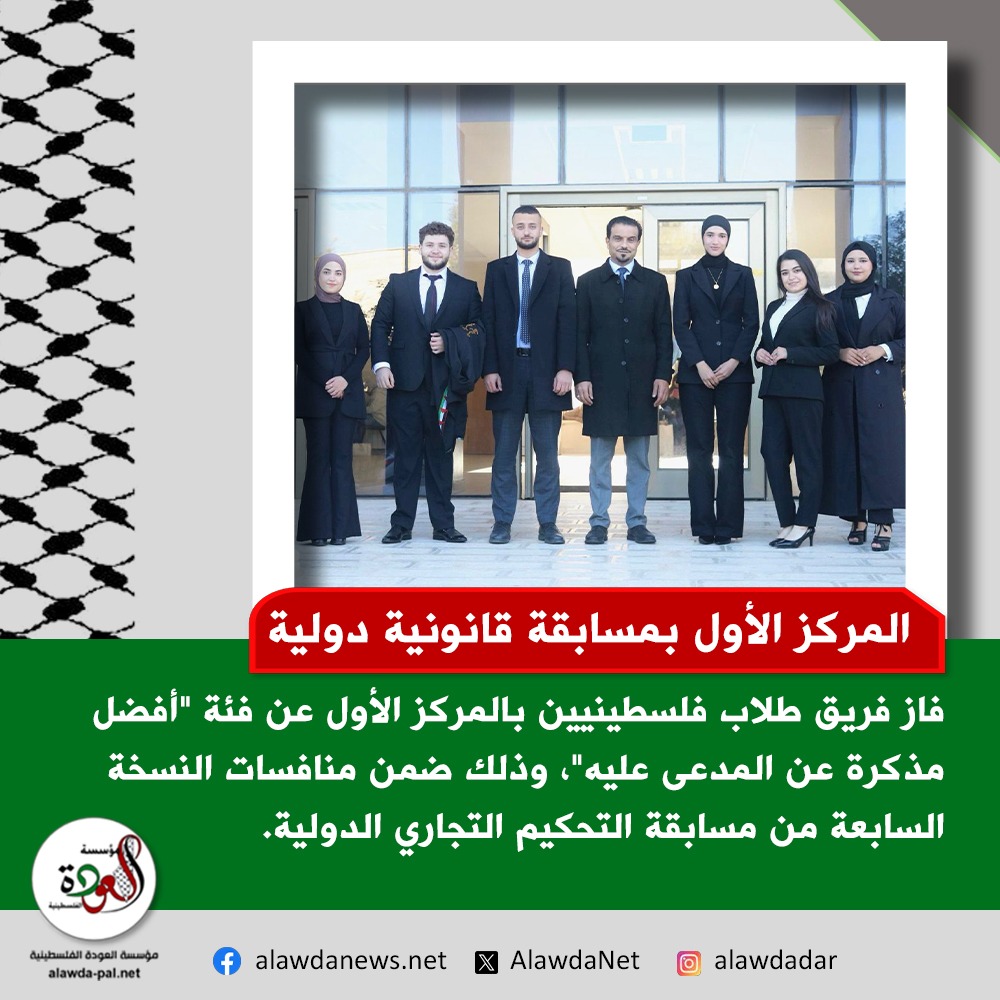 في تظاهرة قانونية دولية كبرى بالمملكة العربية السعودية، فاز فريق طلاب فلسطينيين بالمركز الأول عن فئة "أفضل مذكرة عن المدعى عليه"، وذلك ضمن منافسات النسخة السابعة من مسابقة التحكيم التجاري الدولية.
