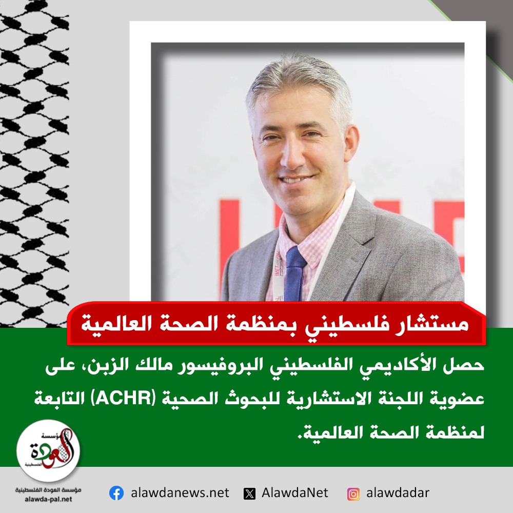 حصل الأكاديمي الفلسطيني البروفيسور مالك الزبن، على عضوية اللجنة الاستشارية للبحوث الصحية (ACHR) التابعة لمنظمة الصحة العالمية لإقليم شرق المتوسط، والتي تأسست عام 1976.