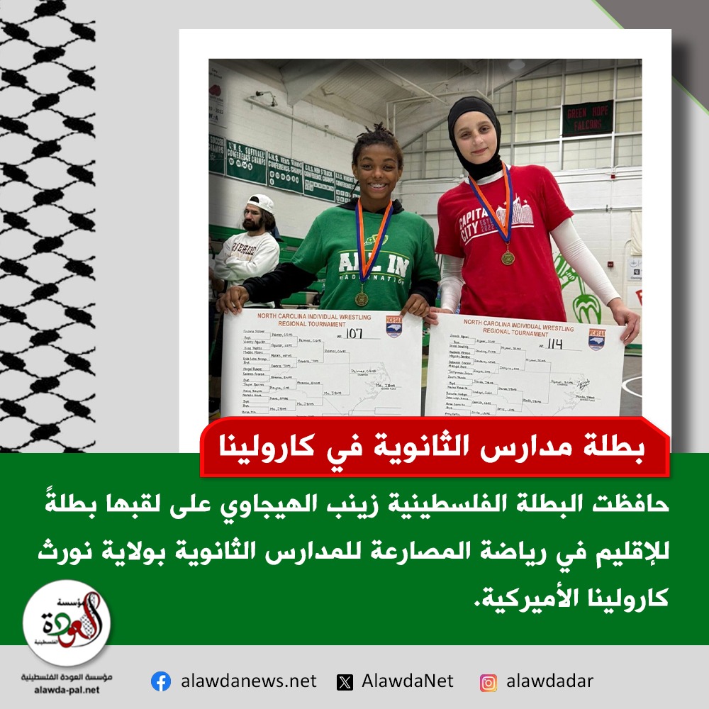 حافظت البطلة الفلسطينية الشابة زينب الهيجاوي على لقبها للمرة الثانية على التوالي، بتتوّيجها بطلةً للإقليم عن وزن 114 باوند في رياضة المصارعة للمدارس الثانوية بولاية نورث كارولينا الأميركية.