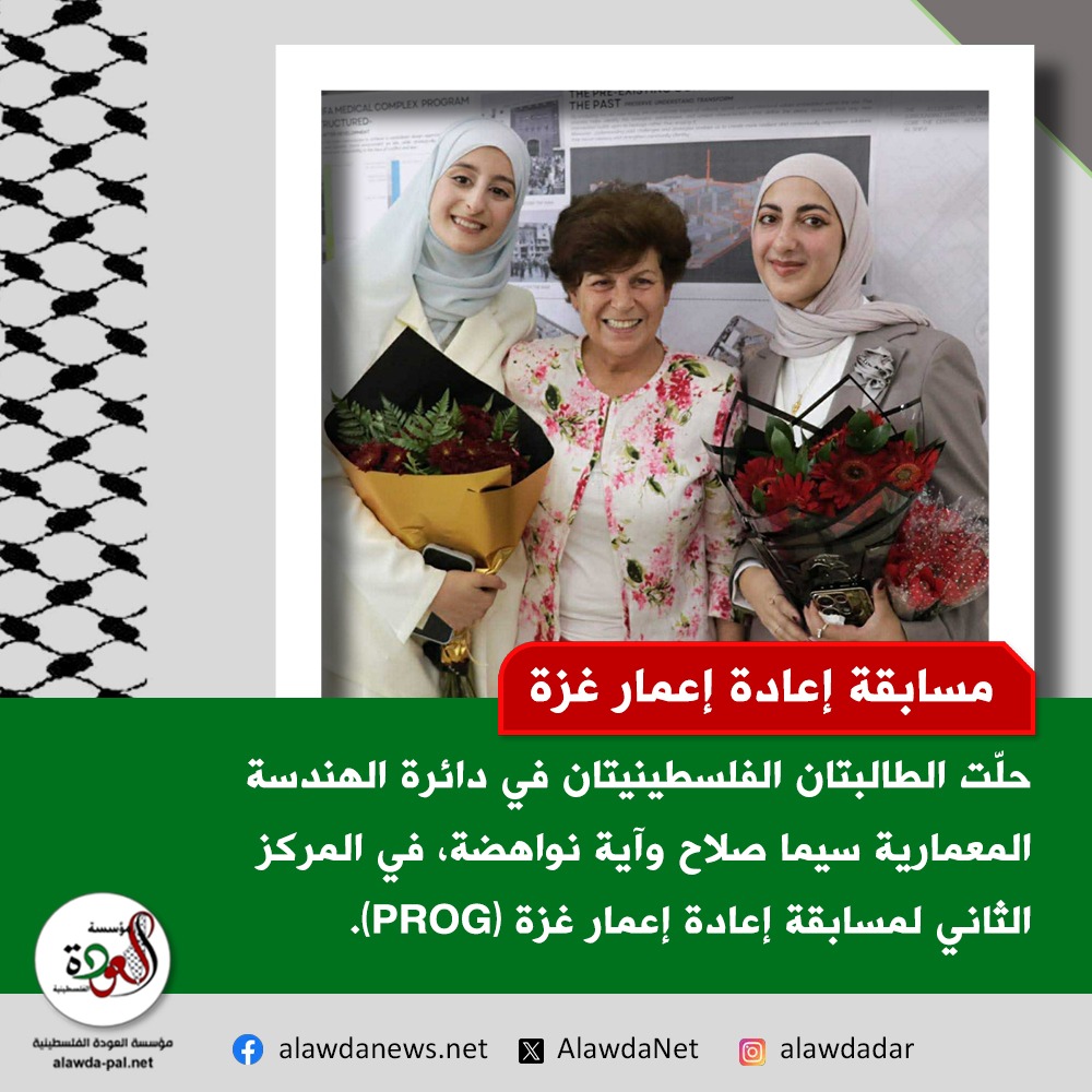 حصدت الطالبتان الفلسطينيتان في دائرة الهندسة المعمارية سيما صلاح وآية نواهضة، المركز الثاني في مسابقة إعادة إعمار غزة (PROG)، عن مشروعهما المعماري "حديقة الشفاء التذكارية للإبادة الجماعية وعيادات الاختصاص"، بإشراف الدكتورة سمر الناظر.