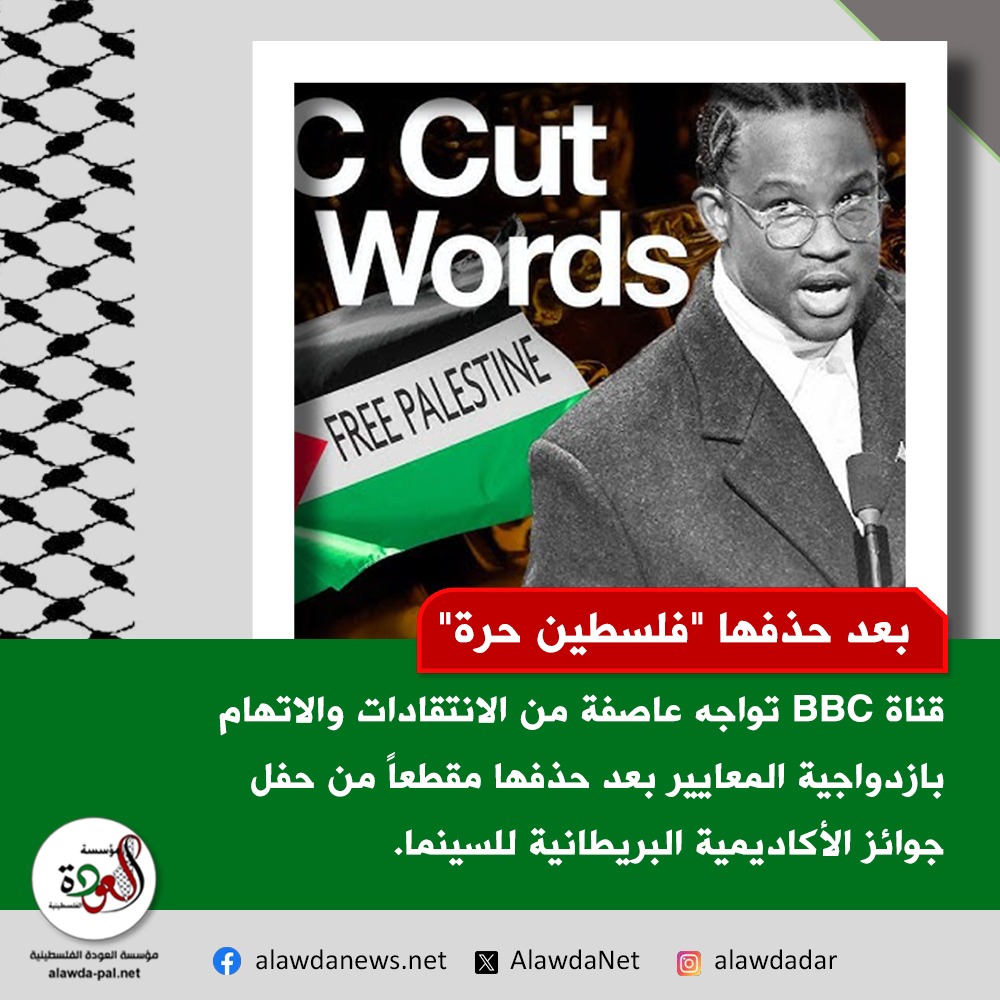 فقد حذفتBBC عبارة "فلسطين حرة" التي أطلقها المخرج الفائز أكينولا ديفيس جونيور، في حين أبقت القناة على "شتيمة عنصرية" بذيئة كانت مسموعة بوضوح ضمن البرنامج نفسه، مما أثار اتهامات بازدواجية المعايير.