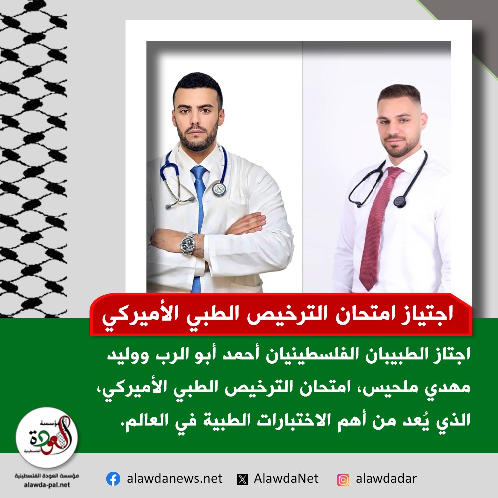 أنهى الطبيبان الفلسطينيان أحمد أبو الرب ووليد مهدي ملحيس، بنجاح امتحان الترخيص الطبي الأميركي (United States Medical Licensing Examination (USMLE، الذي يتكوّن من ثلاث خطوات.