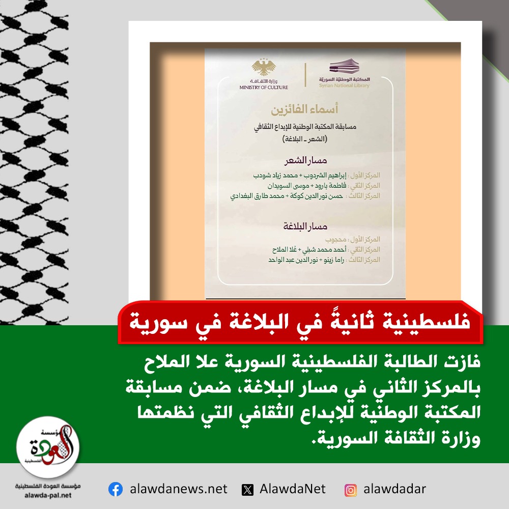حصدت الطالبة الفلسطينية السورية علا الملاح المركز الثاني في مسار البلاغة، ضمن مسابقة المكتبة الوطنية للإبداع الثقافي التي نظمتها وزارة الثقافة السورية، بمشاركة نحو 175 متسابقاً من مختلف المحافظات.