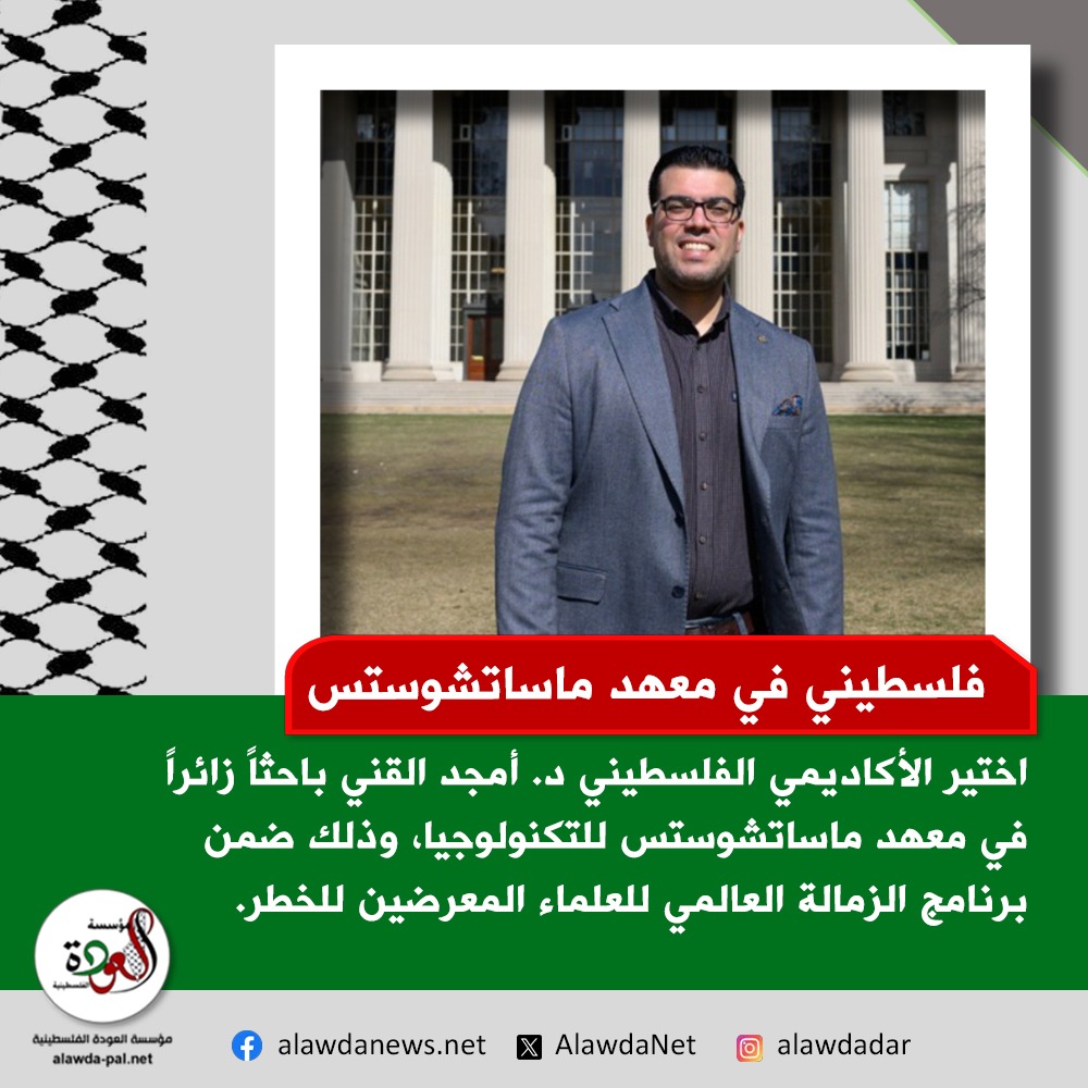 اختير الأكاديمي الفلسطيني د. أمجد القني باحثاً زائراً في معهد ماساتشوستس للتكنولوجيا، وذلك ضمن برنامج الزمالة العالمي للعلماء المعرضين للخطر، الذي يعد واحداً من أكثر البرامج البحثية تنافسية واستقطاباً للكفاءات على مستوى العالم.
