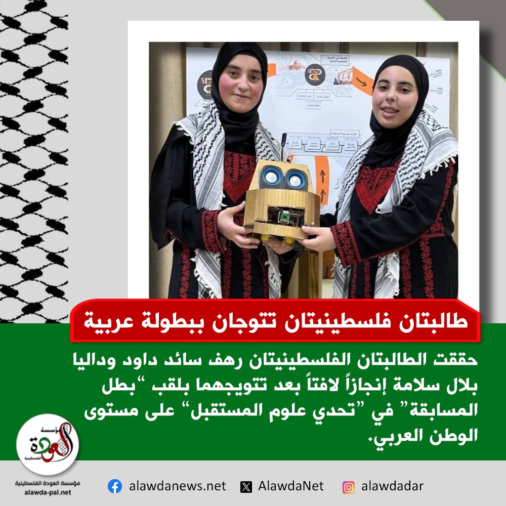 وجاء فوز الطالبتين، من مدرسة بنات أبو علي إياد في قلقيلية، عن مشروعهما “المرشد السياحي الذكي (مسار)”، بإشراف المدربة مرام شمس الدين سلامة، متفوقتين على مئات الفرق المشاركة، في إنجاز يعكس حضوراً فلسطينياً مميزاً في مجالات الابتكار والتكنولوجيا.
