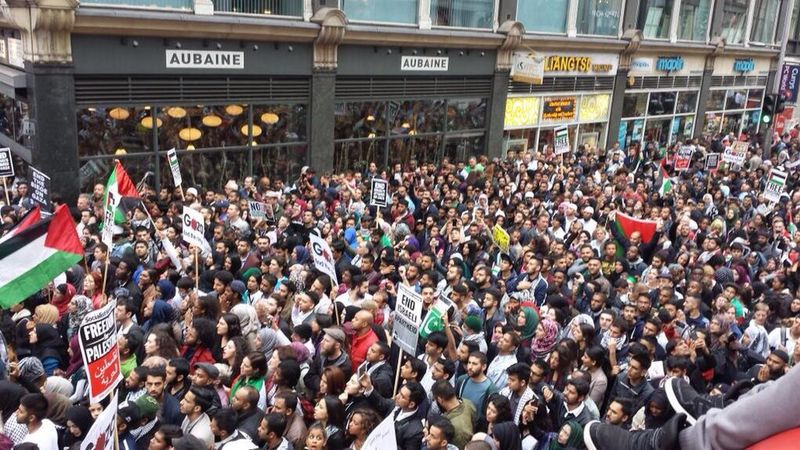 وشهدت العاصمة البريطانية لندن ازدحاماً مرورياً خانقاً بسبب آلاف المتظاهرين الغاضبين أمام السفارة الإسرائيلية في وسط المدينة. كما انتفضت الحشود في مانشستر أمام مقر هيئة الإذاعة البريطانية BBC، في مبادرة للتضامن الإعلامي مع غزة.