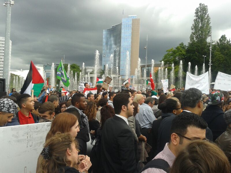 وفي سويسرا تجمّعت حشود في ساحة الأمم المتحدة بجنيف نصرة لغزة، نظمها «الائتلاف لإغاثة فلسطين» collective urgencer Palestine.