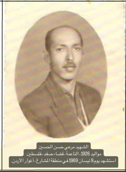 في التاسعِ من نيسان عام 1969، انطلقت روحهُ نحو العلياءِ، وارتقى جسدُهُ شهيداً على ترابِ الأغوارِ، لكنَّ صدى صرختهِ ظلَّ يهدرُ: لن ننسى... لن نغفر! لم يكن مرعي الحسين مجرَّدَ مقاتلٍ رحلَ، بل كانَ رايةً زرعها الزمنُ في قلوبِ الأحرارِ، فما زالت عيناهُ، حتّى بعدَ استشهادِهِ، تنظرانِ إلى الأفقِ، تترقَّبانِ شروقَ الشمسِ على أرضِ فلسطين.