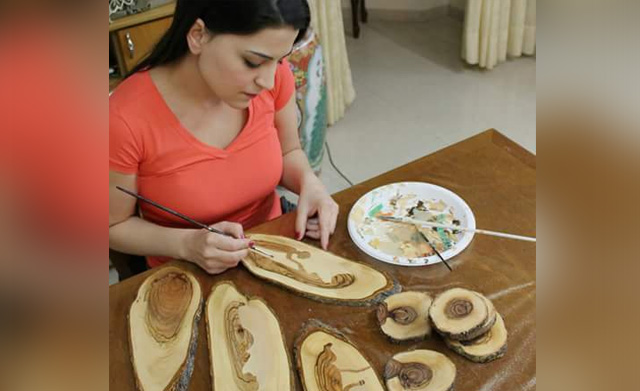 فأبتكرت طريقة الرسم بالزيتون حيث تقوم بجمع حباته، وتضعها على قماشة بيضاء، ثم تقوم بطرقه بالمطرقة وتستغل ما يخرج منه من زيت لتشكيل لوحاتها الفنية.
