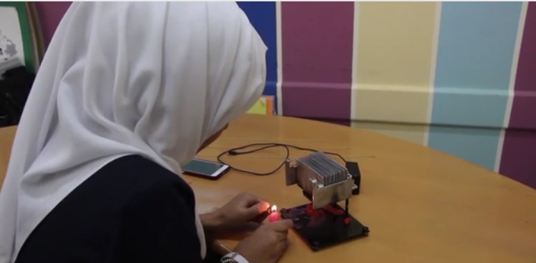 لذلك فكرت شهد أبو لبدة أن تتطرق إلى مشكلة الكهرباء وتوفر جهاز "كهرو-حراري" يعتمد على الحرارة في توليد الكهرباء، لاستخدامه في شحن الهاتف المحمول.