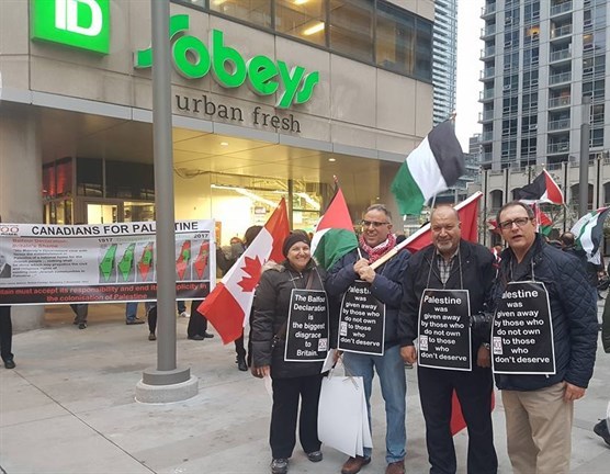فقد نظّم العشرات من الناشطين الفلسطينيين والكنديين وقفة اعتصامٍ أمام القنصلية البريطانية في مركز مدينة تورونتو في ذكرى مرور مائة عام على وعد بلفور المشؤوم وما تسببه من مأسي للشعب الفلسطيني.