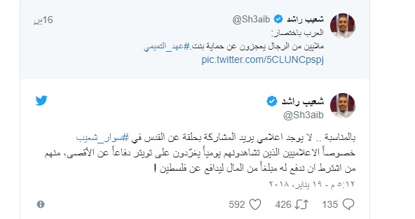إعلامي كويتي يكشف عن إعلاميين عرب اشترطوا مبلغاً خرافياً للمشاركة بحلقةٍ عن القدس