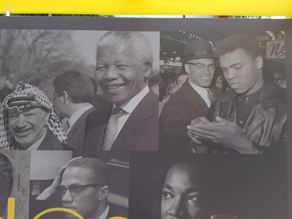 وتم وضع لوحة كبيرة في مدخل القاعة تتوسطها صورة الرئيس الفلسطيني الراحل ياسر عرفات، الى جانب الرموز العالمية المناهضة للتمييز العنصري مثل مانديلا، ومحمد علي كلاي.