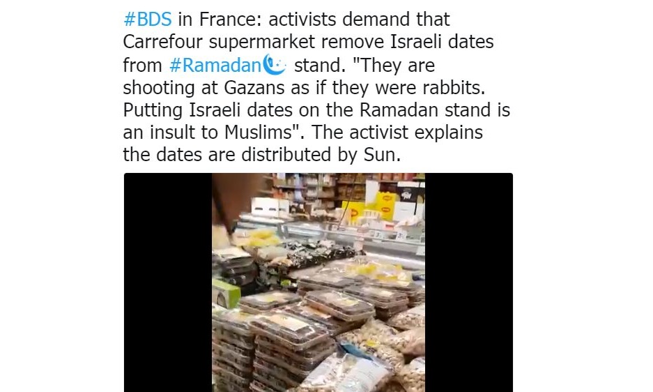 اعترض أحد الزبائن المسلمين بمدينة تشامبوسي غرب العاصمة الفرنسية باريس، على بيع متجر "كارفور" في المدينة بلحاً إسرائيلياً، كونه يحمل إساءةً للمسلمين والفلسطينيين تحديداً بسبب انتهاكات الاحتلال المتواصلة بحقهم.