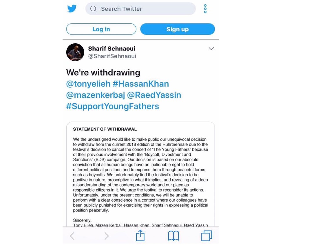 فقد كانت إدارة المهرجان الألماني قد طالبت فرقة "Young Fathers" الاسكتلندية بالتنصّل من دعمها لحركة مقاطعة إسرائيل وسحب الاستثمارات منها وفرض العقوبات عليها (BDS)، فرفضت الفرقة الطلب، لتقوم إدارة المهرجان بإلغاء دعوة الفرقة.