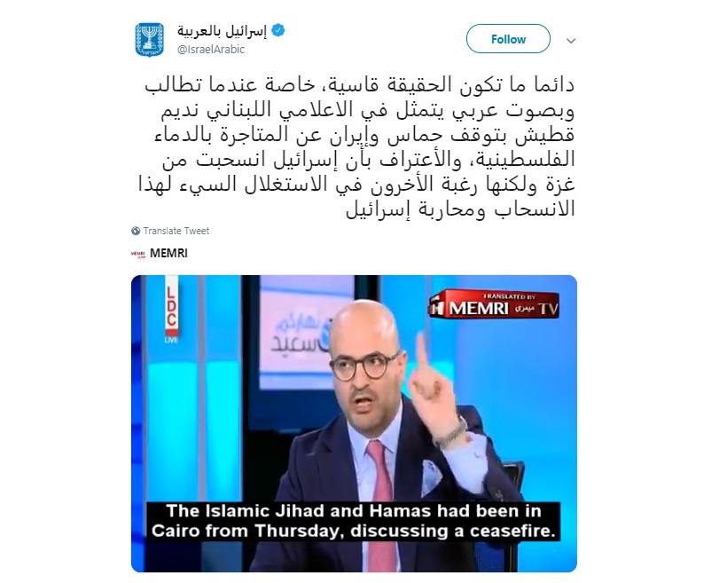 وتضمّنت تغريدة صفحة "إسرائيل بالعربية"، التابع لوزارة الخارجية الإسرائيلية «دائما ما تكون الحقيقة قاسية، خاصة عندما تطالب وبصوت عربي يتمثل في الاعلامي اللبناني نديم قطيش بتوقف حماس وإيران عن المتاجرة بالدماء الفلسطينية، والأعتراف بأن إسرائيل انسحبت من غزة ولكنها رغبة الأخرون في الاستغلال السيء لهذا الانسحاب ومحاربة إسرائيل».