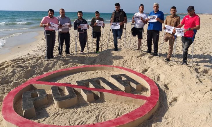 وقف عددٌ من الرياضيين الفلسطينيين مبتوري الأطراف على شاطئ بحر غزة، يطالبون شركة (بوما Puma) الألمانية للملابس والأدوات الرياضية، لإنهاء رعايتها الرسمية للاتحاد الإسرائيلي لكرة القدم الذي يضمّ فرقاً في مستوطنات إسرائيل غير الشرعية على الأراضي الفلسطينية المحتلة.