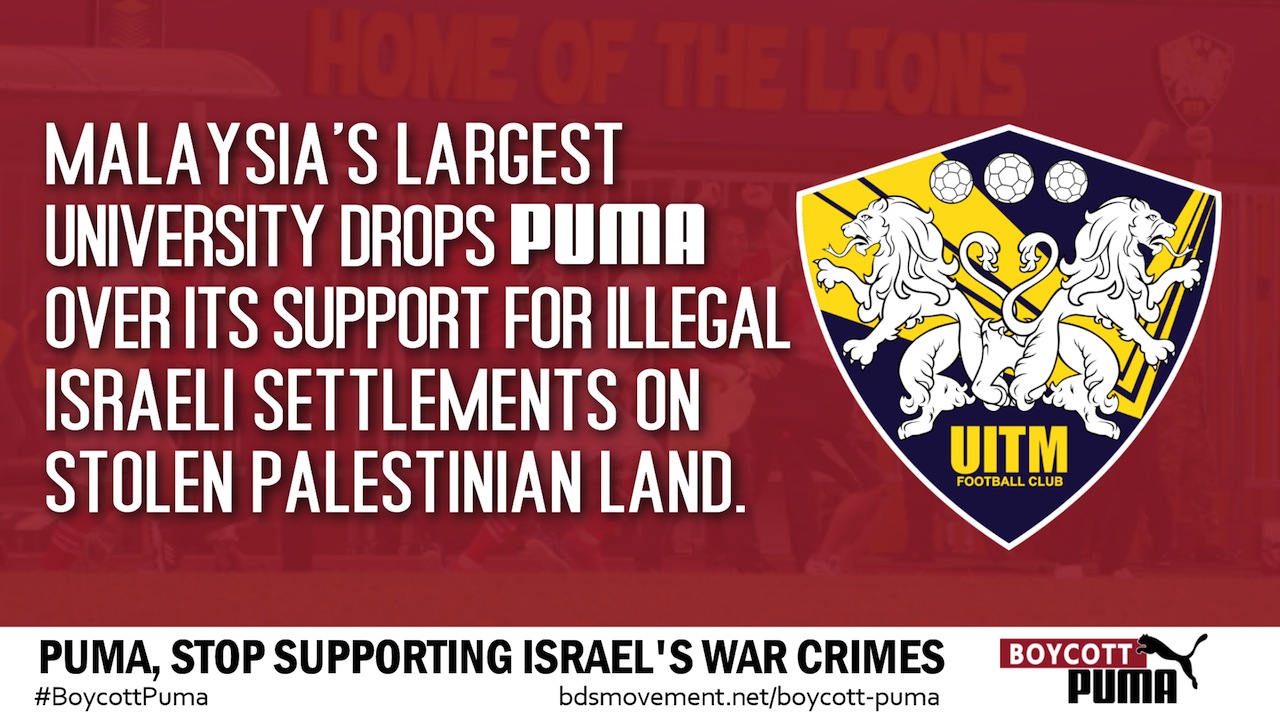 أعلنت جامعة UiTM أكبر الجامعات الماليزية، إنهاءها اتفاقية رعايةٍ مع العلامة التجارية الرياضية "بوما Puma"، بسبب رعايتها لاتحاد كرة القدم الإسرائيلي (IFA)".