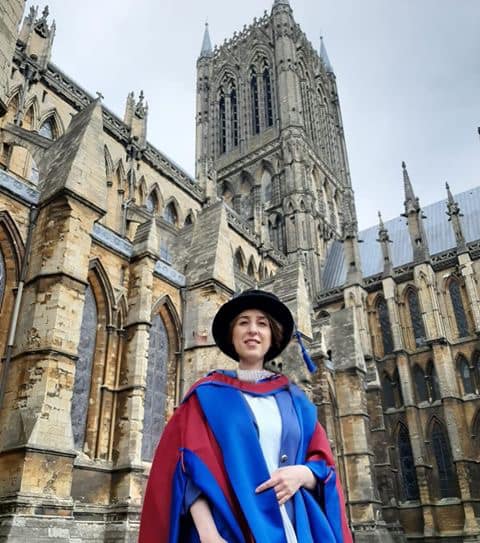 وهي حاصلة على منحة "Hespal" من المجلس الثقافي البريطاني لدراسة الدكتوراه في جامعة Lincoln في بريطانيا والتي تخرجت منها عام 2019، ومثّلت خلالها الطلاب الدوليّين في العديد من المحافل.