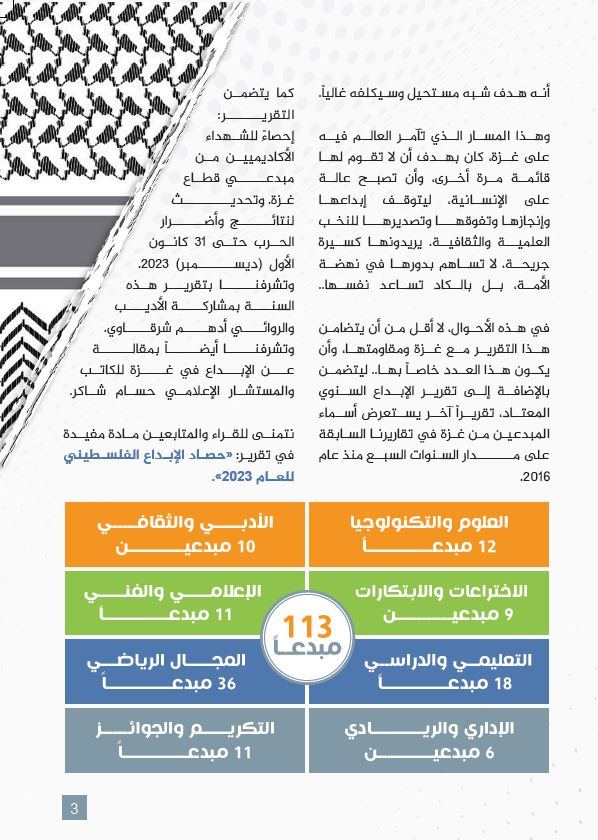 كما لا يخفى علينا أن عدداً ليس بالقليل من مبدعي غزة المذكورين في حصاد الإبداع السنوي، قد استُشهدوا أو استُهدفت بيوتهم ومؤسساتهم، لما لهذه النخبة من تأثير في إعادة البناء.