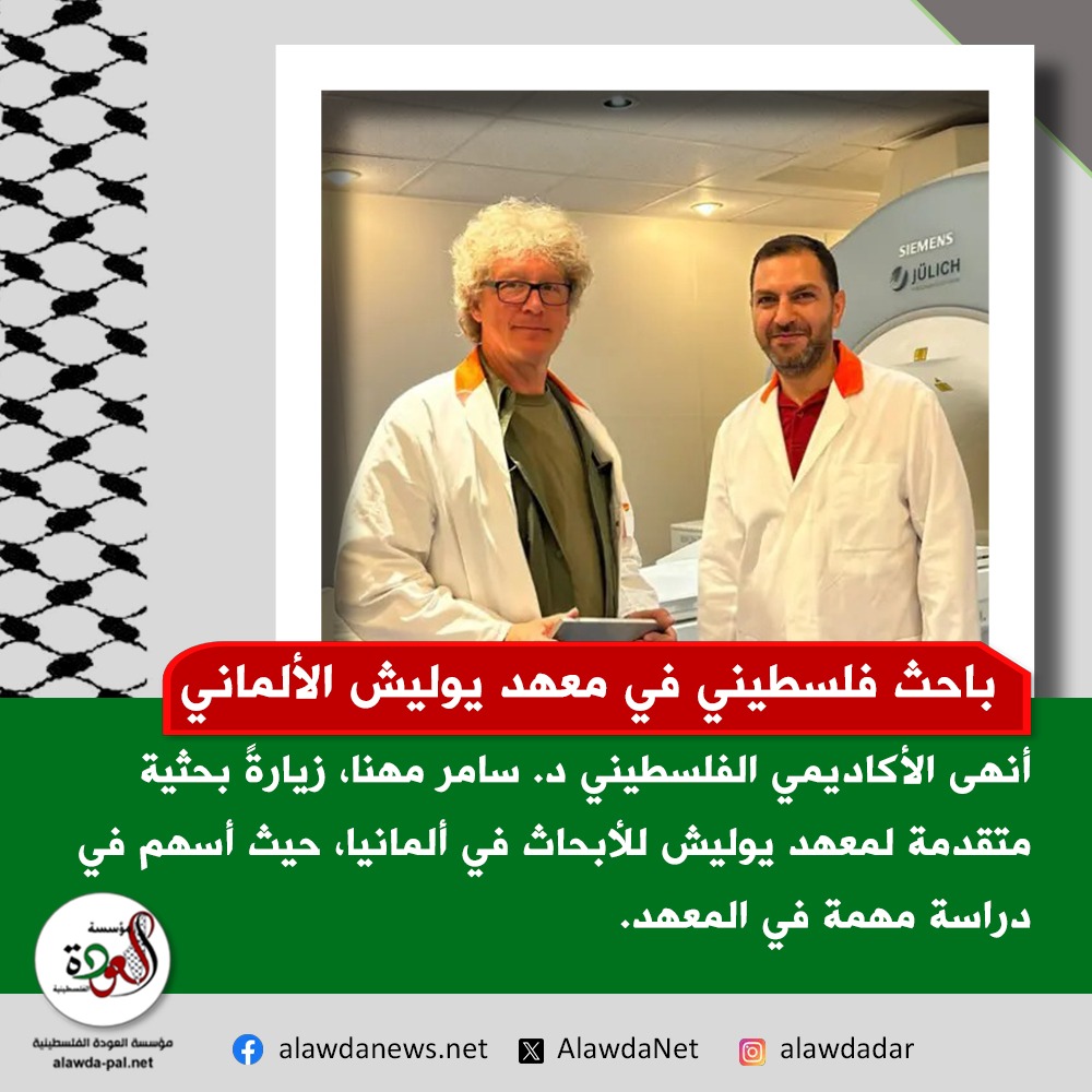 في إنجازٍ بحثي نوعي، أنهى الأكاديمي الفلسطيني د. سامر مهنا، زيارةً بحثية متقدمة إلى معهد علوم الأعصاب والطب التابع لمعهد يوليش للأبحاث في ألمانيا، حيث أسهم في تنفيذ دراسة تُعد الأولى من نوعها داخل المعهد.