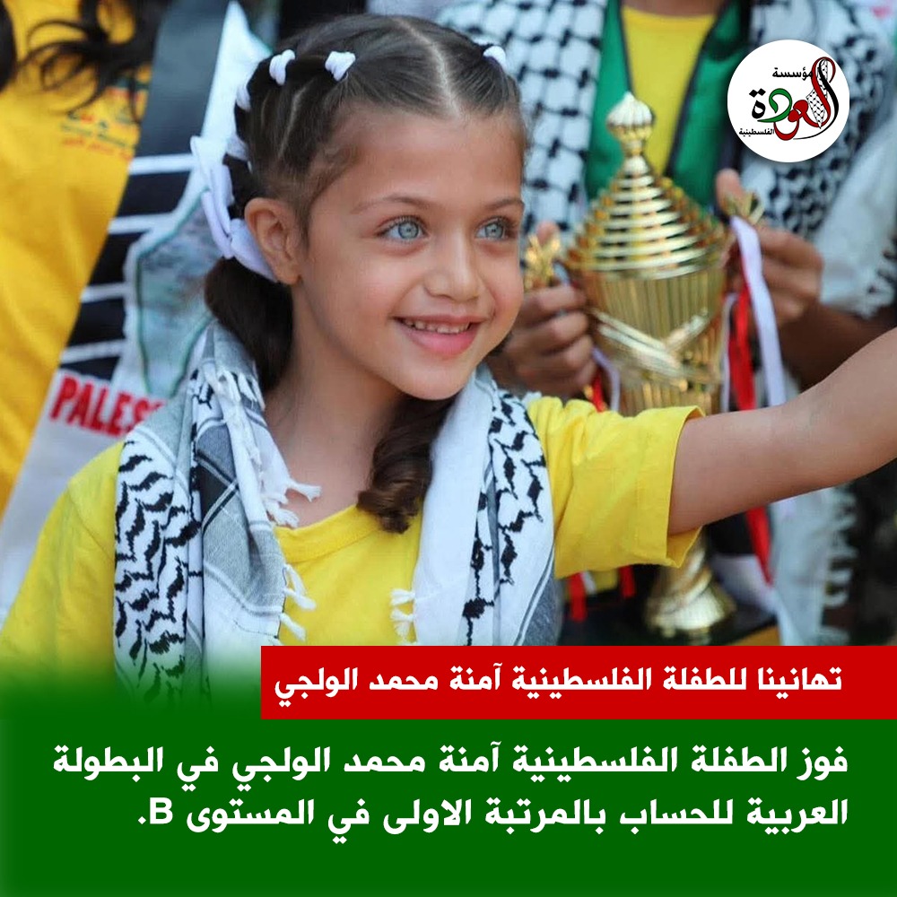 أما الطالبة آمنة محمد موسى سليمان الولجي من مدرسة بنات عمران المختلطة في مدينة أريحا فقد فازت بالمرتبة الأولى فضية في المستوى B.