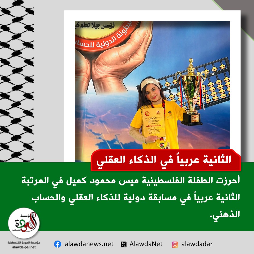 أحرزت الطفلة الفلسطينية ميس محمود كميل من بلدة قباطية في قضاء جنين المرتبة الثانية على المستوى العربي في مسابقة دولية للذكاء العقلي والحساب الذهني.