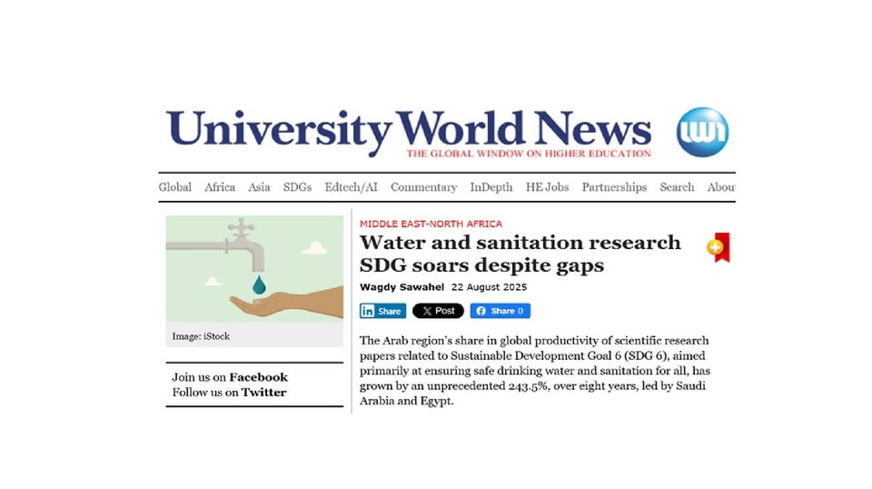فقد سلّط الموقع الضوء على الدراسة التي أعدّها الأكاديمي د. عاهد زيود، من قسم الكيمياء في جامعة النجاح الوطنية، والتي أعدّها تحت عنوان "Assessing progress on Sustainable Development Goal 6 in the Arab world through performance and visualization analysis".