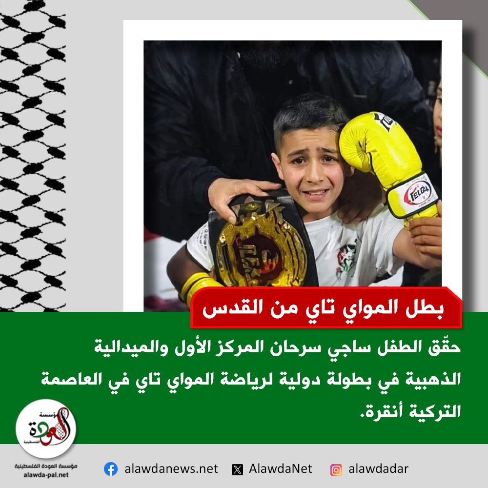 حقّق الطفل المقدسي ساجي سرحان من بلدة سلوان في القدس المحتلة، إنجازاً رياضياً جديداً بتتويجه بالمركز الأول والميدالية الذهبية في بطولة دولية لرياضة المواي تاي (WMF) أُقيمت في العاصمة التركية أنقرة وذلك بعد فترة قصيرة من إحرازه الميدالية البرونزية في بطولة سابقة أُقيمت في أرمينيا.