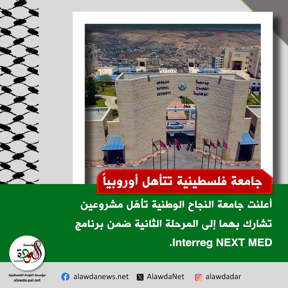 أعلنت جامعة النجاح الوطنية تأهّل مشروعين تشارك فيهما إلى المرحلة الثانية ضمن برنامج Interreg NEXT MED، من بين نحو 800 مشروع تقدّمت من مختلف دول المنطقة الأورو-متوسطية، في إنجاز علمي جديد يعكس الحضور الفلسطيني المتنامي في برامج التعاون الدولية.