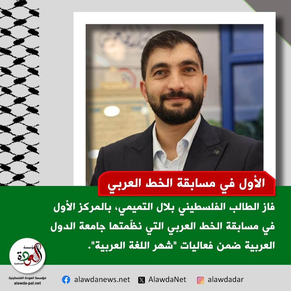 فاز الطالب الفلسطيني بلال التميمي، بالمركز الأول في مسابقة الخط العربي التي نظّمتها جامعة الدول العربية ضمن فعاليات "شهر اللغة العربية".