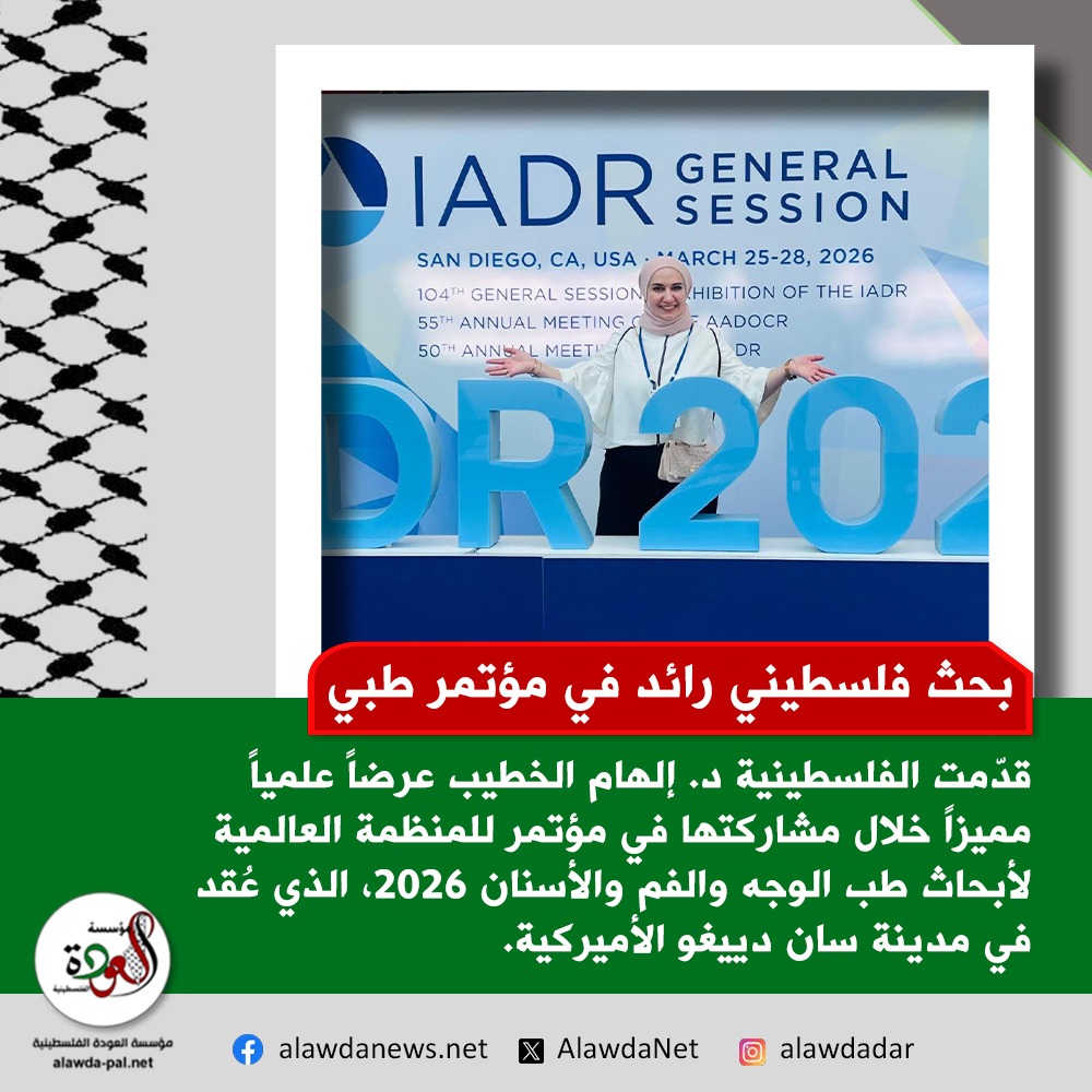 قدّمت الأكاديمية الفلسطينية د. إلهام الخطيب عرضاً علمياً مميزاً خلال مشاركتها في المؤتمر العالمي للمنظمة العالمية لأبحاث طب الوجه والفم والأسنان 2026، الذي عُقد في مدينة سان دييغو الأميركية.