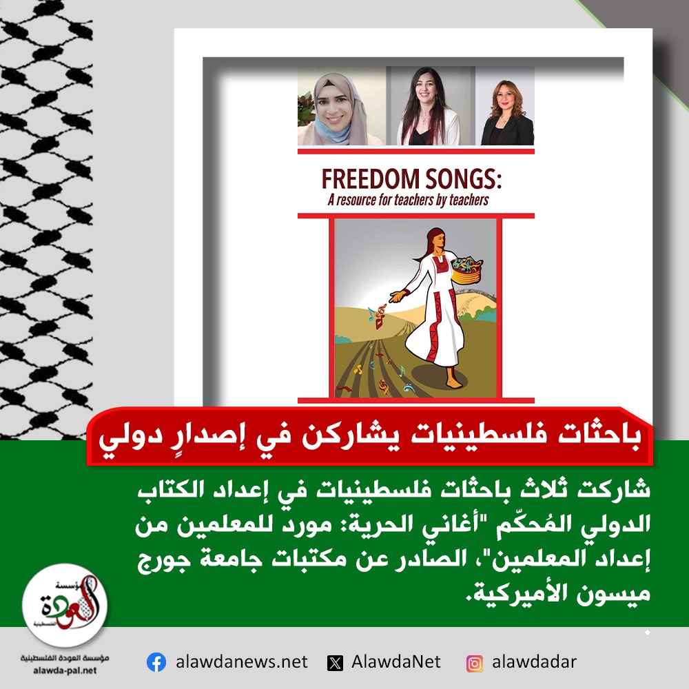 شاركت ثلاث باحثات فلسطينيات في إعداد الكتاب الدولي المُحكّم "أغاني الحرية: مورد للمعلمين من إعداد المعلمين"، الصادر عن مكتبات جامعة جورج ميسون الأميركية.