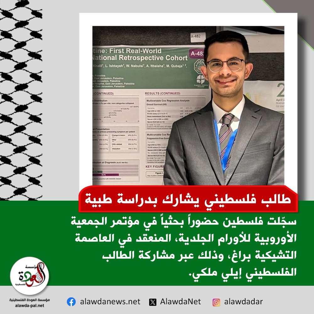 سجّلت فلسطين حضوراً بحثياً في أعمال النسخة الثانية والعشرين من مؤتمر الجمعية الأوروبية للأورام الجلدية، المنعقد في العاصمة التشيكية براغ، وذلك عبر مشاركة الطالب إيلي ملكي بملصق بحثي استعرض نتائج دراسة طبية هي الأولى من نوعها على مستوى الوطن.